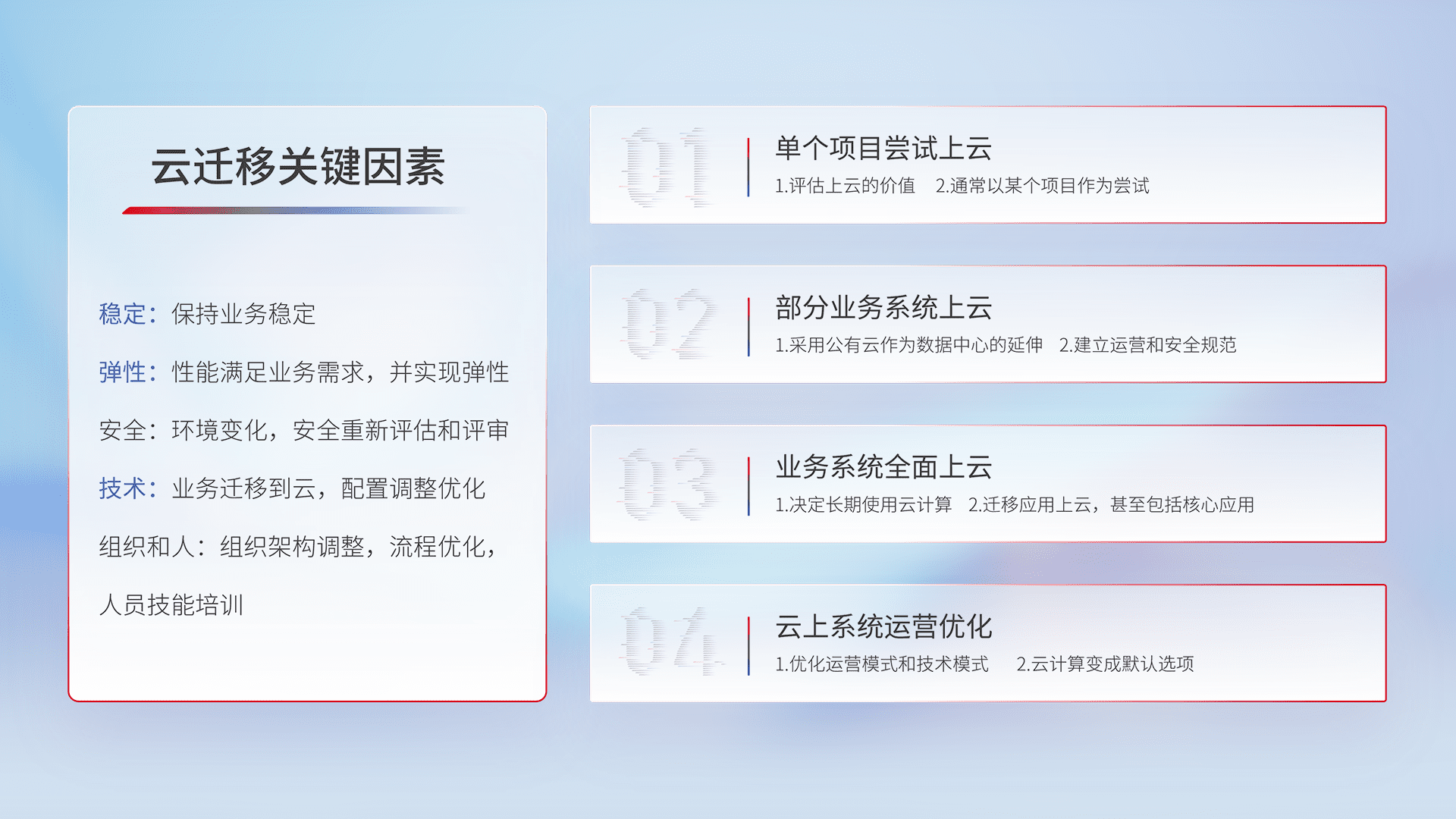 结合实际业务,,从规划设计、、云平台选型、、、、云原生改造、、数据迁移、、、集成交付,,,,迁移全过程为客户识别最佳上云路径,,,,做好风险识别管理,,,,设计网络架构、、身份权限、、、、安全审计合规、、、操作审计、、、日志审计、、、、监控告警策略、、、、多站点容灾设计等,,,,对云上基础设施进行整体规划,,提升IT治理水平,,,以满足弹性、、、、高可用、、、、高性能的需求。。。