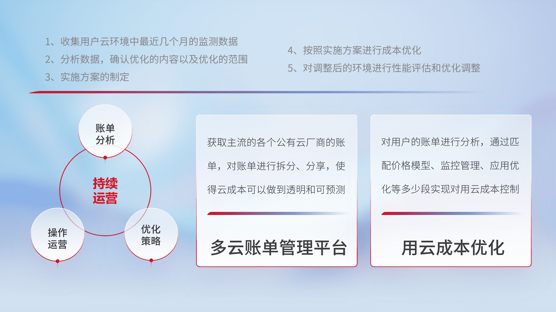 通过多云纳管,,,,以统一的资源数据模型把客户的云资源进行抽象和封装,,,,进而实现对多云资源的统一操作,,,保障云资源管理的可靠性、、、、稳定性与可用性。。量身定制化运维内容,,,,配置、、开发运维、、、补丁管理、、、备份、、、、监控、、、认证和访问管理、、、审计和日常巡检等,,,,保障在用云过程中的可靠度,,稳定度以及高可用率。。。。
